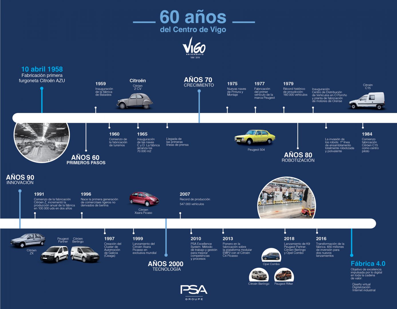 Hace más de 60 años, Vigo hizo valer sus ventajas técnicas y geográficas ante Cádiz y Barcelona para acoger una nueva fábrica de automóviles de una conocida marca francesa. Citroën se decantó por la alternativa gallega debido a tres motivos: la existencia de la Zona Franca, un factor clave para la idea inicial de exportar furgonetas 2 CV a Marruecos; por el acceso a un puerto de primer nivel que permitía una conexión rápida con Francia y por la disponibilidad de una mano de obra cualificada, debido a la fuerza de la industria naval y a dos instituciones educativas prestigiosas: la Escuela de Artes y Oficios, abierta en 1886, y la Escuela de Ingeniería Industrial, fundada en 1901. El 10 de abril de 1958 coincidieron la colocación de la primera piedra de lo que es hoy el Centro de Producción de PSA en Vigo con la producción del primer Citroën AZU con rumbo a Marruecos.