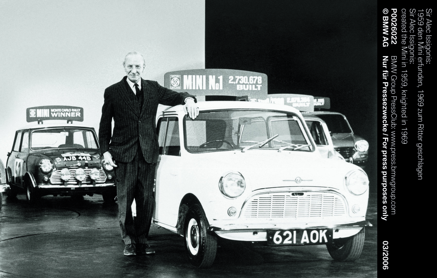 El Mini es obra del diseñador e ingeniero Alec Issigonis que diseñó un vehículo para cuatro persona con una longitud de 3,05 metros; con las dimensiones mínimas necesarias para una familia tipo británica. El maletero cubicaba 195 litros, mientras que el precio de venta en su lanzamiento fue de 496 libras esterlinas.