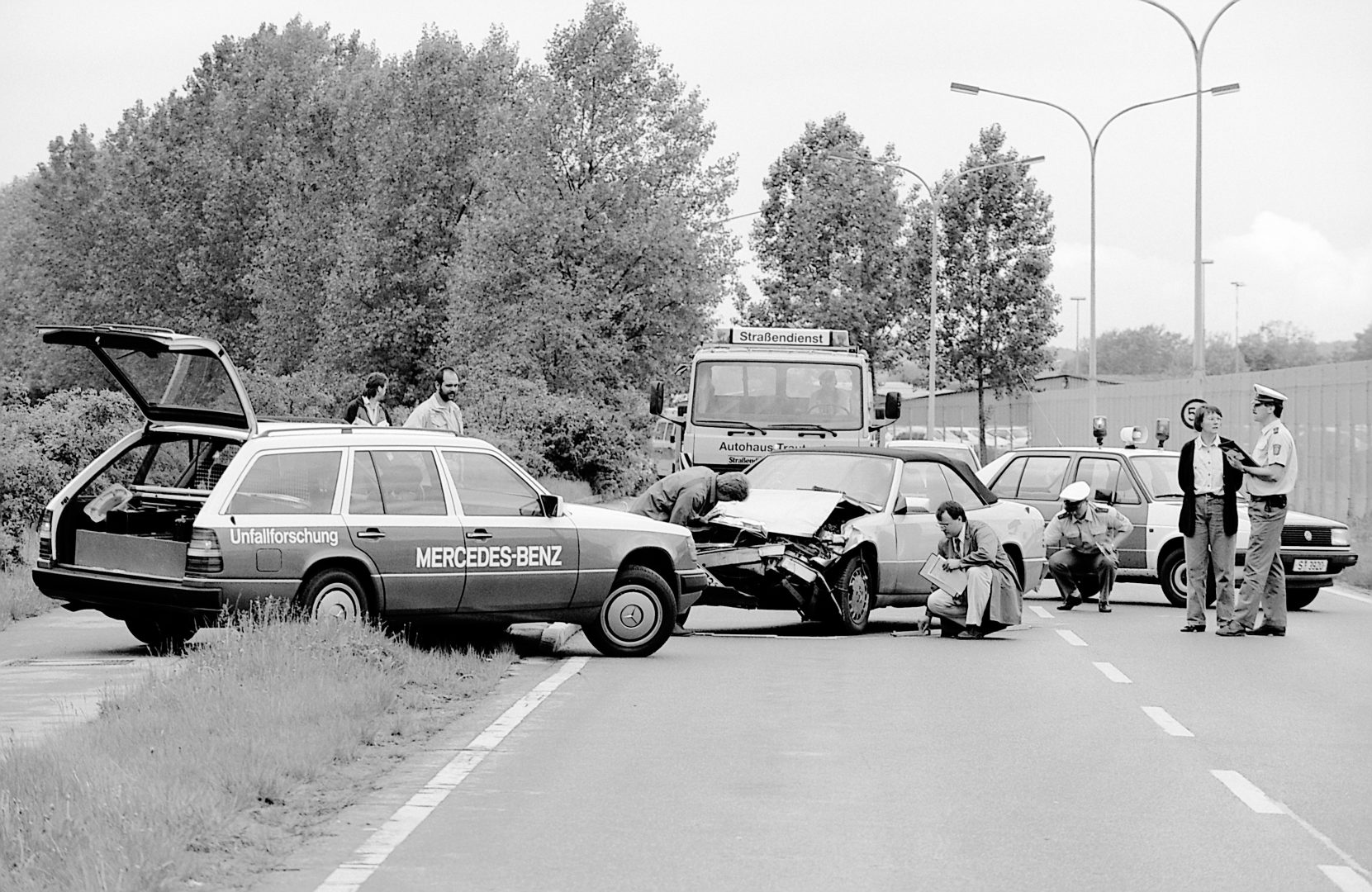 Mercedes inició las investigaciones en “crash-test” el 10 de septiembre de 1959 en la planta de Sindelfingen; aunque en 1956 ya había comenzado a desarrollar componentes pensando en la seguridad en accidentes.