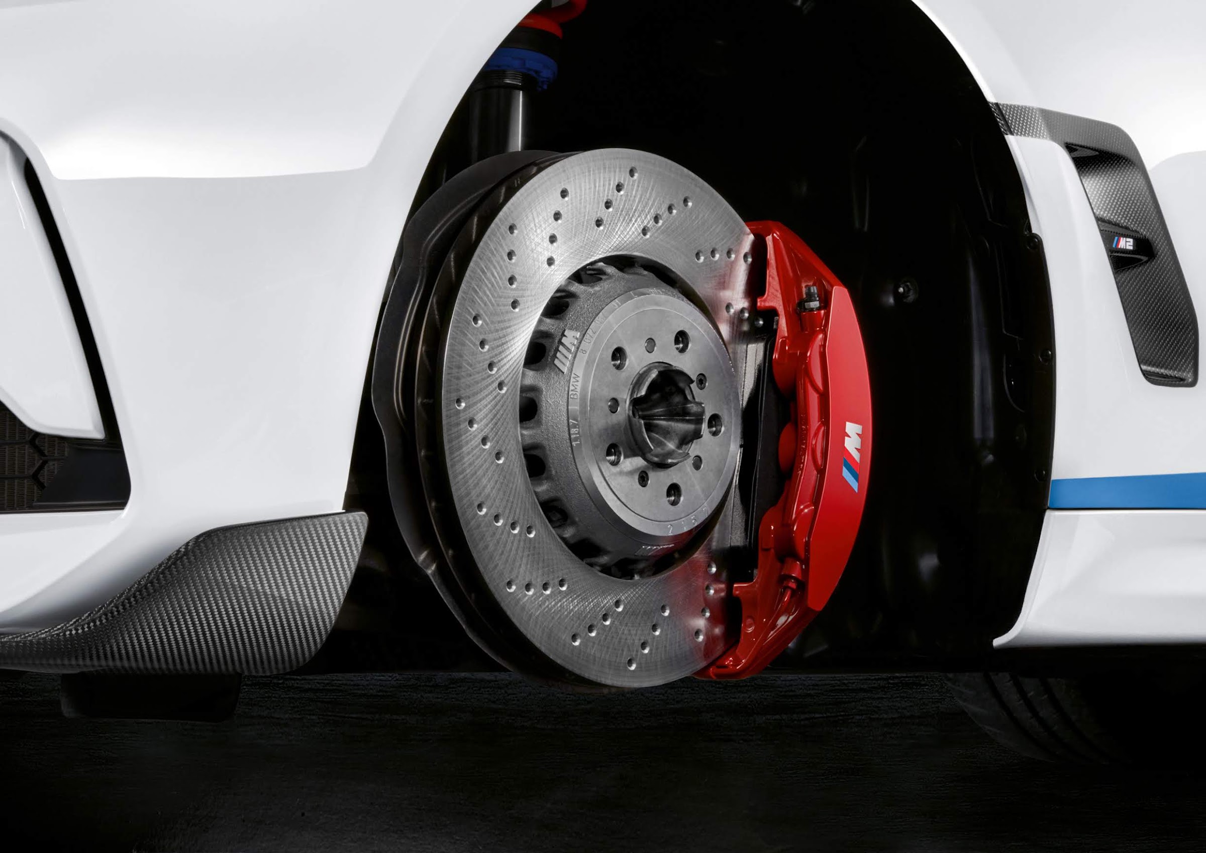 Los discos de freno de dimensiones superiores, ventilados internamente y perforados BMW M Componed Break Discs aseguran una resistencia térmica superior en comparación con el equipo de frenos de la versión de serie. Las pinzas fijas de aluminio de 6 pistones en el eje delantero y las pinzas fijas de 4 pistones en el eje trasero generan una mayor fuerza de frenado en condiciones extremas. También están disponibles unas pastillas de freno deportivas, derivadas de las pastillas de freno para largas distancias que se emplean en competición, desarrolladas para proporcionar un excelente rendimiento de frenado bajo una alta carga térmica.