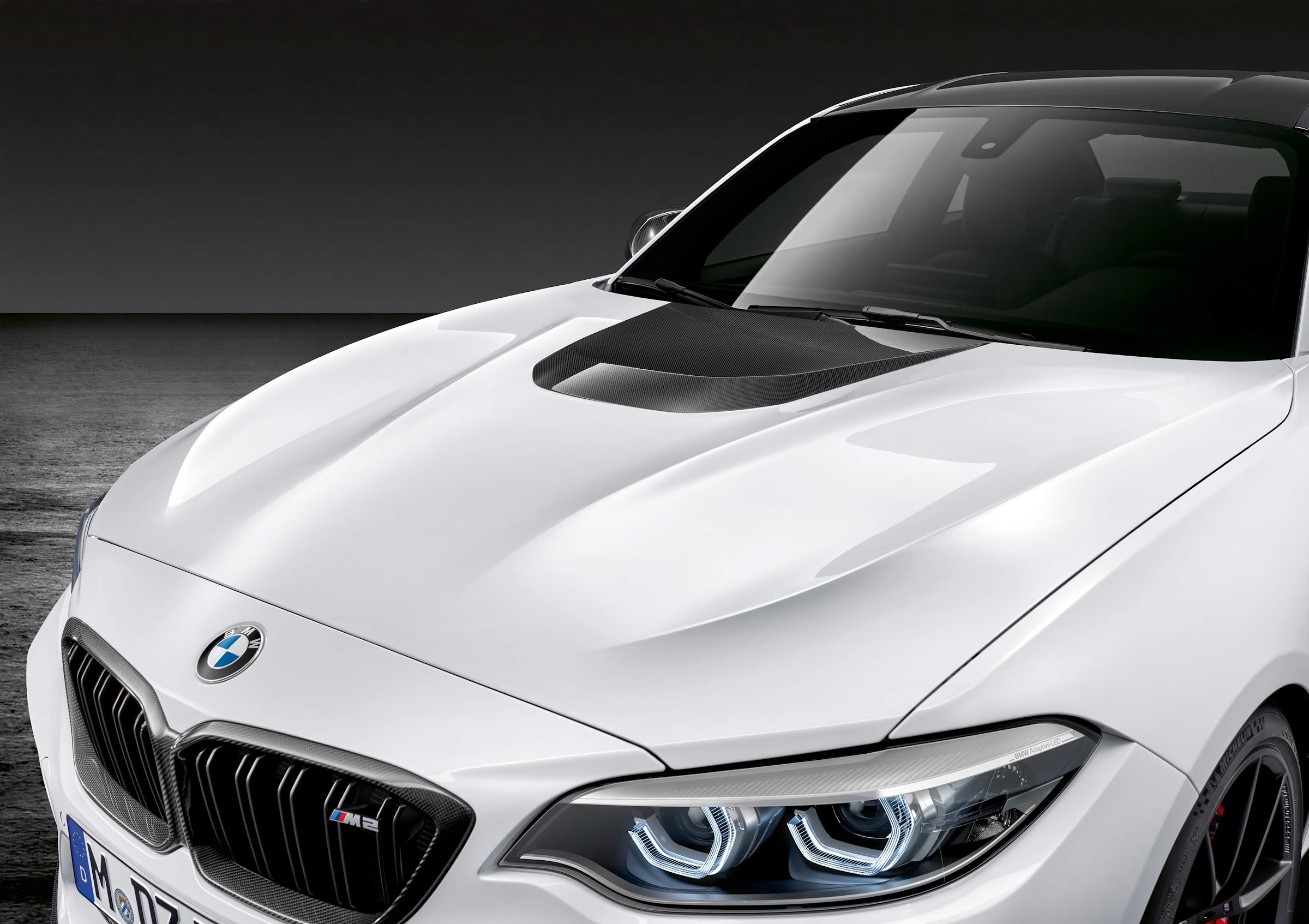 El nuevo capó M Performance, fabricado en fibra de carbono barnizada, este capó reduce la carga en el eje delantero en aproximadamente 9 kg. Puede combinarse con el techo y la tapa del maletero M Performance de fibra de carbono. Ambos elementos,disponibles a partir de noviembre de este año, también están realizados en fibra de carbono barnizada y suponen un ahorro de peso de 5 kg (el techo) y de 6 kilos (la tapa del maletero). Además de presentar fibra de carbono barnizada parcialmente visible en el exterior, el interior del portón trasero está hecho completamente de fibra de carbono. Los paneles laterales delanteros izquierdo y derecho M Performance en fibra de carbono reducen aún más el peso. Además, también hay disponibles las salidas de aire integradas fabricadas en fibra de carbono (estarán disponibles a partir de noviembre).