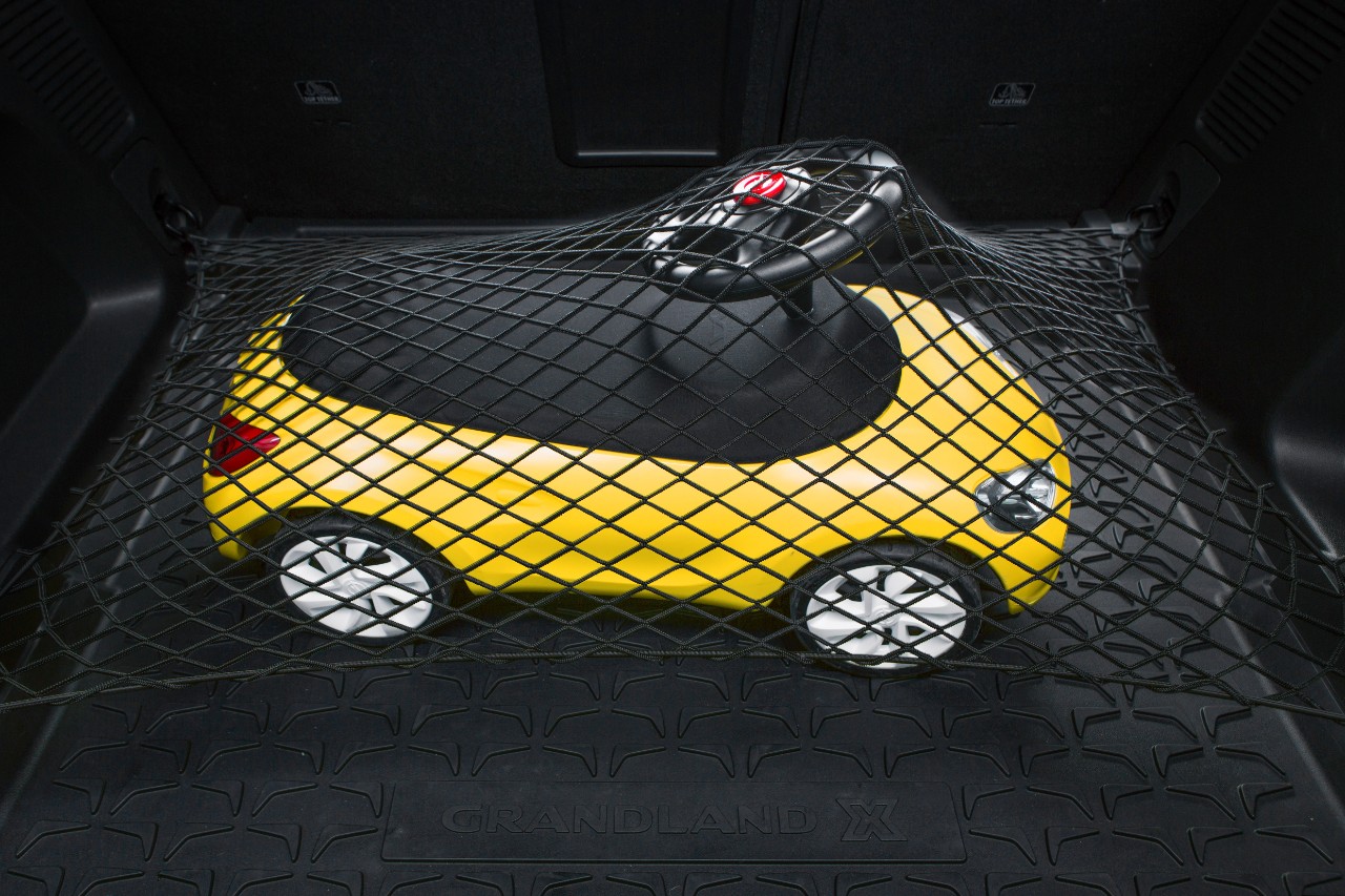 La rejilla de carga de seguridad, separa a los pasajeros de la zona de carga. La rejilla de acero con acabado en negro se fija detrás de los reposacabezas de los asientos traseros. La zona de carga también puede dividirse de forma flexible con la red de carga Opel. La red se fija con ganchos a las anillas de sujeción del suelo del espacio de carga del Grandland X y mantiene los objetos en su lugar con seguridad evitando que se deslicen.