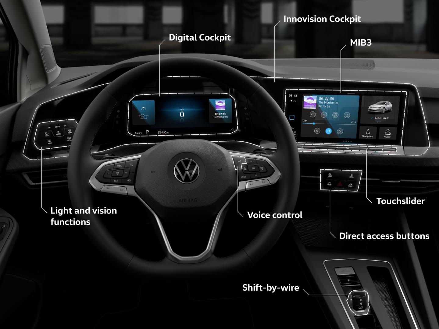 En su interior ofrecerá de serie, mandos digitales y hápticos, un Digital Cockpit de 10,25 pulgadas y una pantalla central del sistema de infoentretenimiento de 8 pulgadas. Otra de las novedosas tecnologías que incorpora esta nueva generación, es el sistema de conexión entre vehículos e infraestructuras Car2X (inteligencia de enjambre) de serie. Este sistema permite “conectarse” con el entorno para conocer el estado del tráfico, incidencias en las vías y la información de otros vehículos hasta 800 m de distancia. Un sistema que no solo aporta información sino también seguridad en la vías. Por otra parte, estrena un nuevo sistema de reconocimiento y control por voz y el asistente “Hola Volkswagen”, que interpreta las instrucciones recibidas por el conductor.