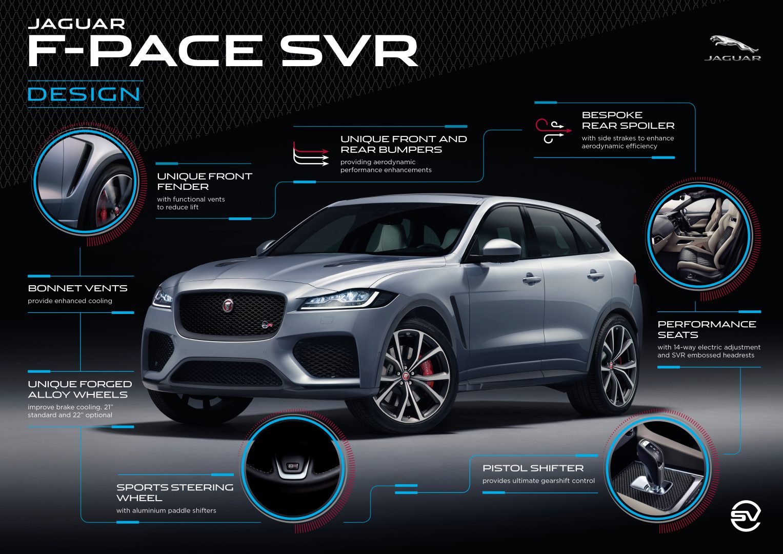 Diseñado por Special Vehicle Operations (SVO), está versión trae un aumento del 44% en potencia, el motor V8 5.0 litros F-PACE SVR rinde 550Cv y 680Nm de par, lo que le permite alcanzar 0-100 km/h en 4.3 segundos con una velocidad máxima de 283 km/h.