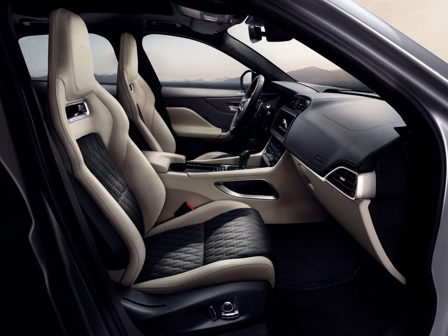 En el interior el F-PACE SVR cuenta con asientos delanteros con soporte lateral mejorado e incorporan grabado el logotipo SVR en relieve. El volante de la marca SVR presenta levas para el cambio en aluminio.