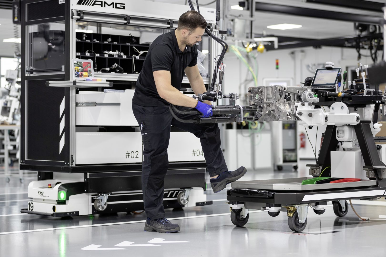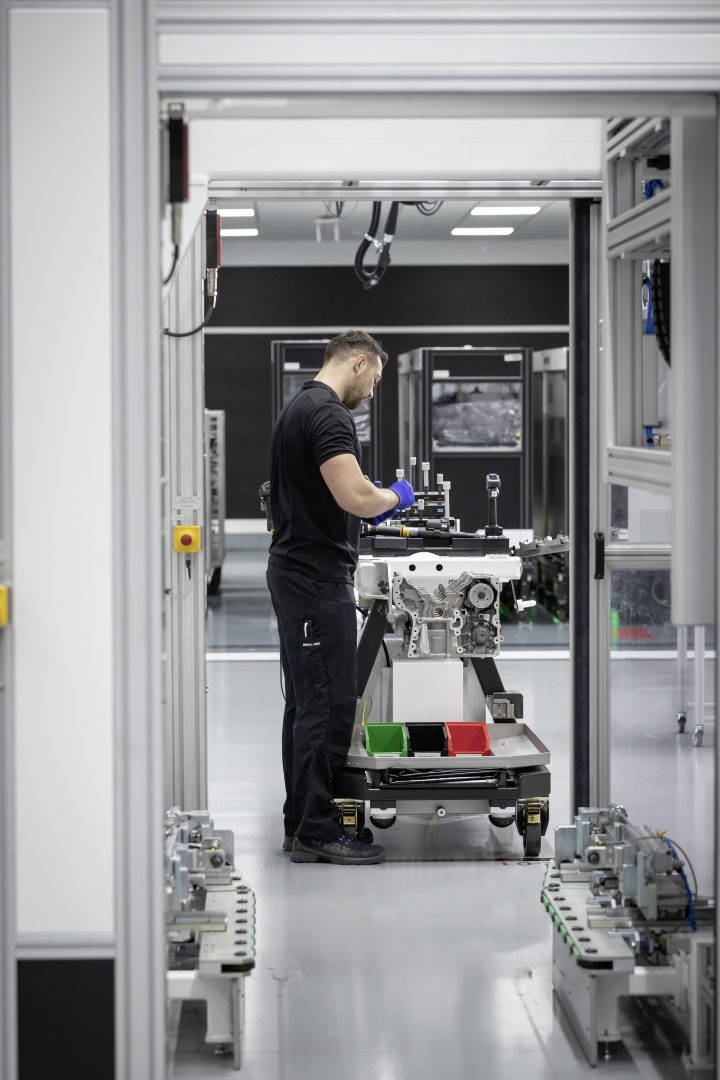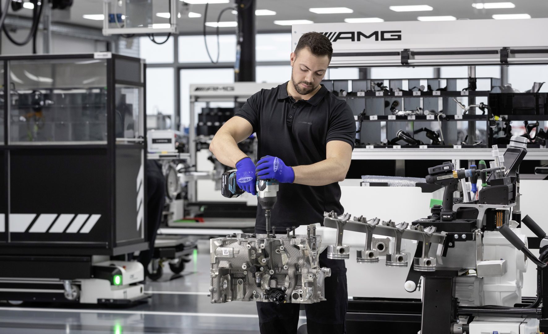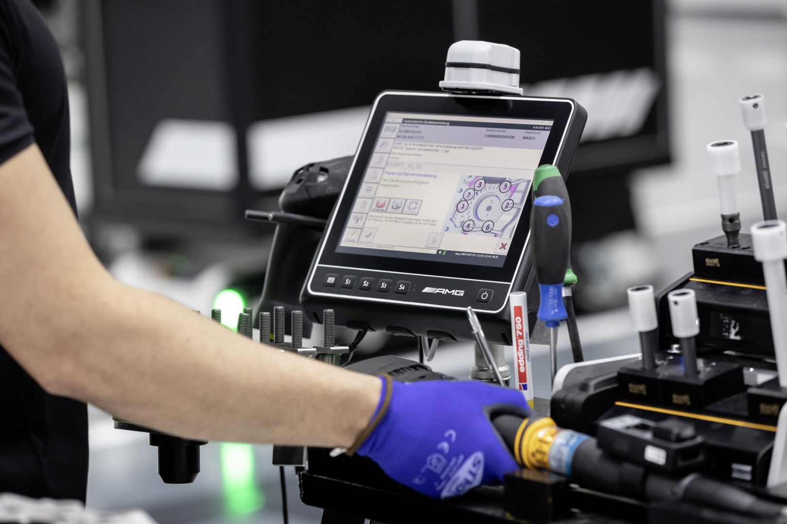 Como se ha señalado la fabricación de este motor responde a la filosofía tradicional de AMG “Un hombre, un motor” pero introduciendo las nuevas tecnologías de fabricación. Así el responsable del montaje dispone de un carro con toda la herramienta e integra una tableta que le facilita asistencia con indicaciones de montaje. Las herramientas utilizadas son del tipo sin cables y con conexión wifi, lo que permite que el montador pueda seleccionar desde su tableta la función exacta que debe realizar, por ejemplo, la máxima presión de atornillado.