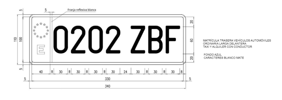 Por último, en el nuevo reglamento se modifican las matrículas de los vehículos destinados a taxi y de alquiler con conductor hasta nueve plazas, que pasan a tener el fondo en color azul con las letras en color blanco, en principio solo en la parte trasera, manteniéndose la numeración. Todos los vehículos que les afecta esta medida tienen un año de plazo para adecuarse.