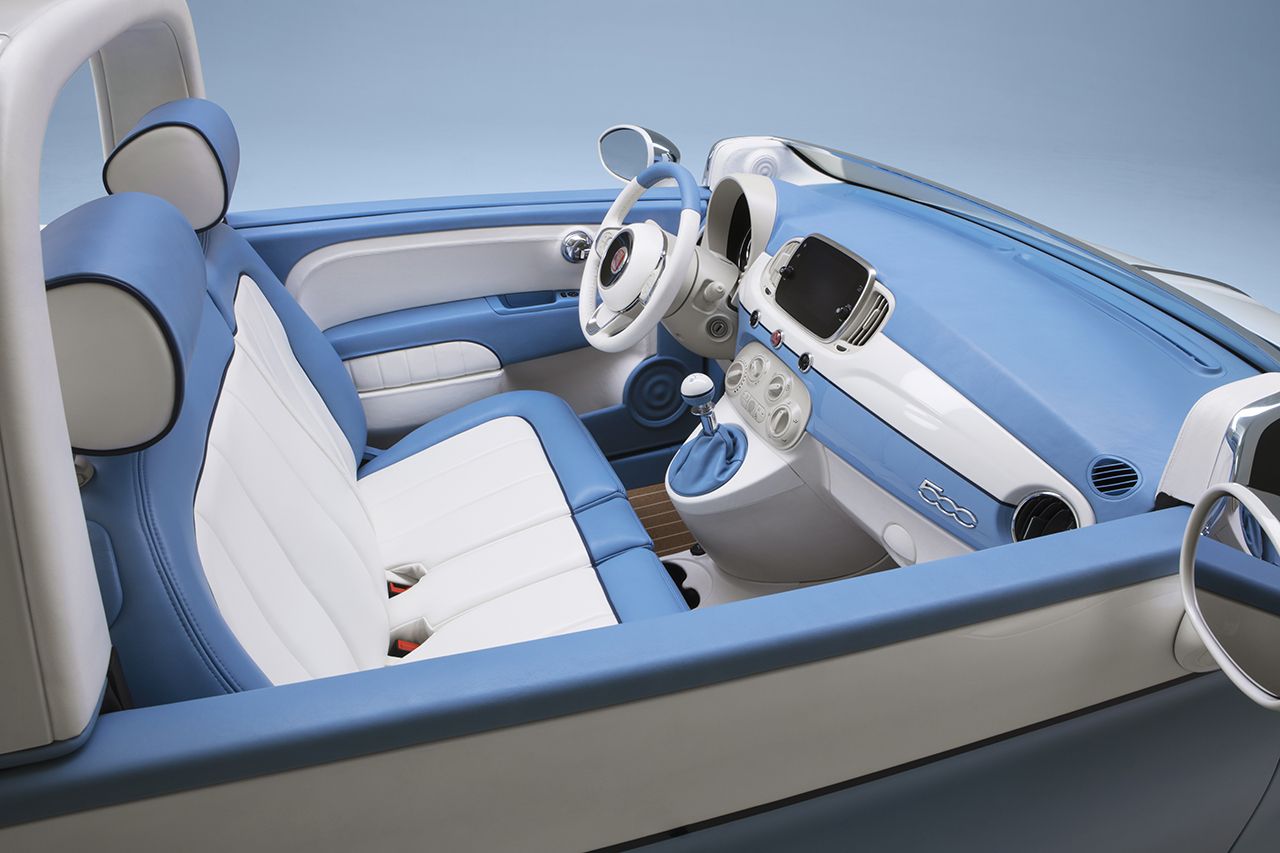 La edición especial se caracteriza por la carrocería en “Volare Blue” con capota blanda beige y llantas de aleación de 16” de diseño vintage. Este esquema de color es exclusivo y añade detalles como las carcasas de los retrovisores cromadas, los logos vintage y el nombre cromado “Spiaggina ‘58” en escritura cursiva en la parte trasera.