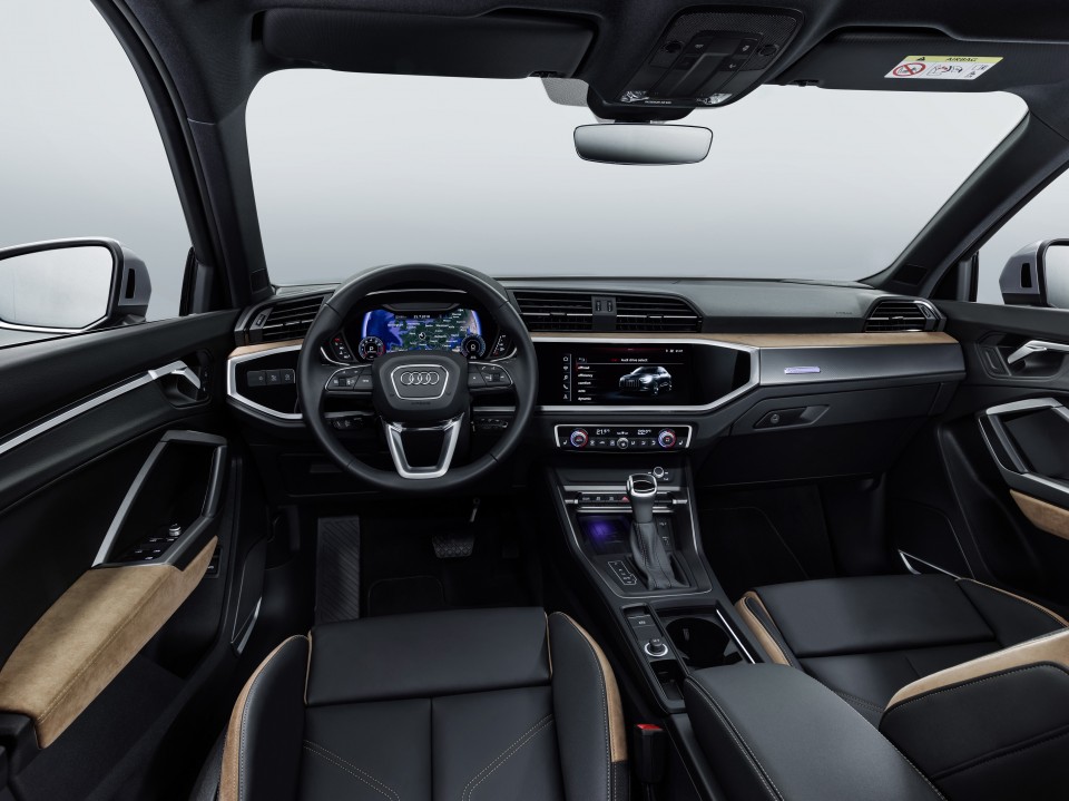 Audi también ha desarrollado un nuevo concepto para los colores y materiales. Los clientes del Q3 pueden elegir entre tres variantes: la versión básica, el paquete Audi design selection y el paquete interior S line. Los dos últimos incluyen asientos deportivos, opcionalmente tapizados con una combinación de cuero natural/sintético y Alcántara. La superficie de Alcántara para el salpicadero y los apoyabrazos de las puertas son una nueva opción de personalización. Están disponibles en tres colores, incluido el naranja bold.