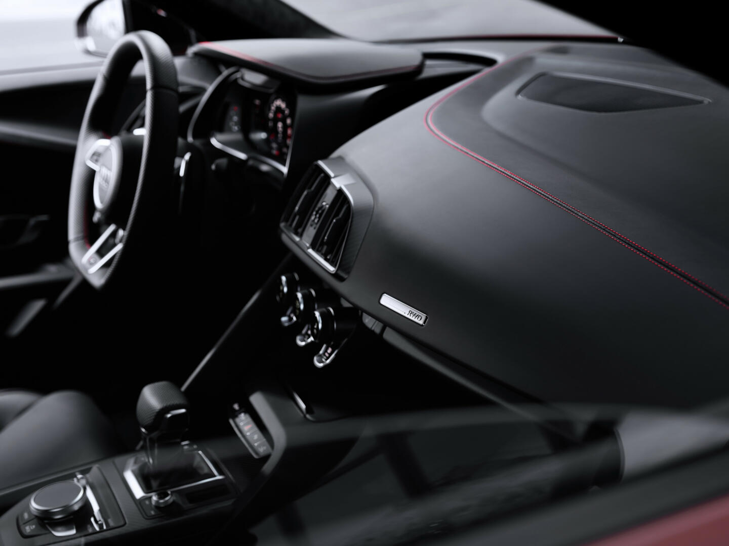 En el interior del R8 Performance trasera el elemento más llamativo es el llamado “Monoposto”, un gran arco de contorno en la zona del conductor que se asemeja al cockpit de un coche de competición. El “Monoposto” rodea la instrumentación Audi virtual cockpit, con una pantalla de 12,3 pulgadas integrada en una carcasa. El volante de cuero multifunción permite controlar el Audi drive select, arrancar el motor, activar el modo Performance y el sistema de sonido del motor o controlar el Audi virtual cockpit.