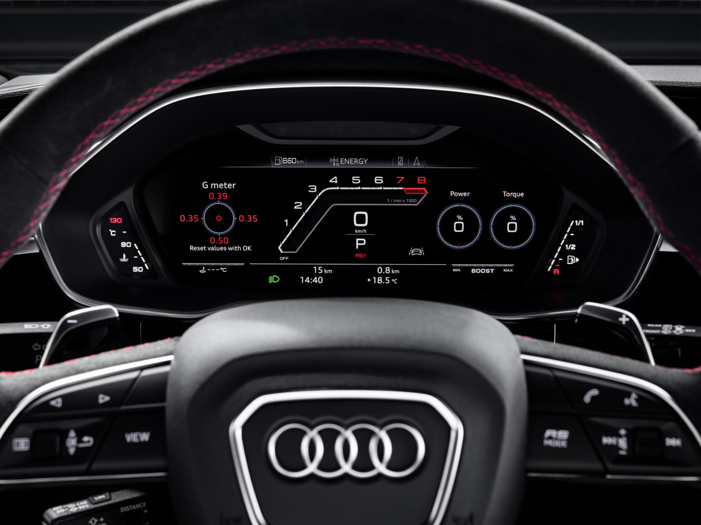 El Cockpit digital tiene una vista exclusiva que nos ayuda a conocer la presión de las ruedas, el par, los cv, tiempos de vuelta, fuerzas g, etc. Las molduras del salpicadero se pueden elegir en otro material distinto al aluminio, como puede ser en piano black o fibra de carbono para que aún sea más deportivo.