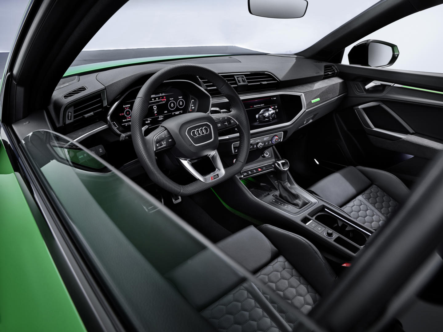 En el interior contamos con pocas novedades respecto a la versión Q3, pero que obviamente continúan con la estética deportiva exterior. Lo primero que nos llama la atención son los asientos. Por primera vez el RS Q3 equipa unos asientos con reposacabezas fijo y con costuras en forma de panel de abejas, como lo hacen sus hermanos mayores. Pueden estar tapizados en cuero Nappa y las costuras en rojo o azul (también lo podemos observar en el volante, puertas, cinturones de seguridad, alfombrillas, etc..).
