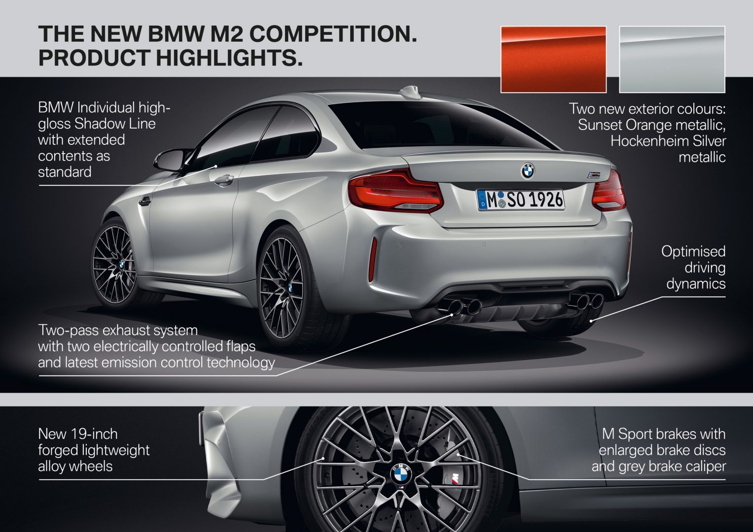 Dos nuevos colores han sido añadidos a la gama disponible, el Sunset Orange metálico ya había aparecido en otros modelos de BMW M Performance y el nuevo y exclusivo Hockenheim Silver metálico.