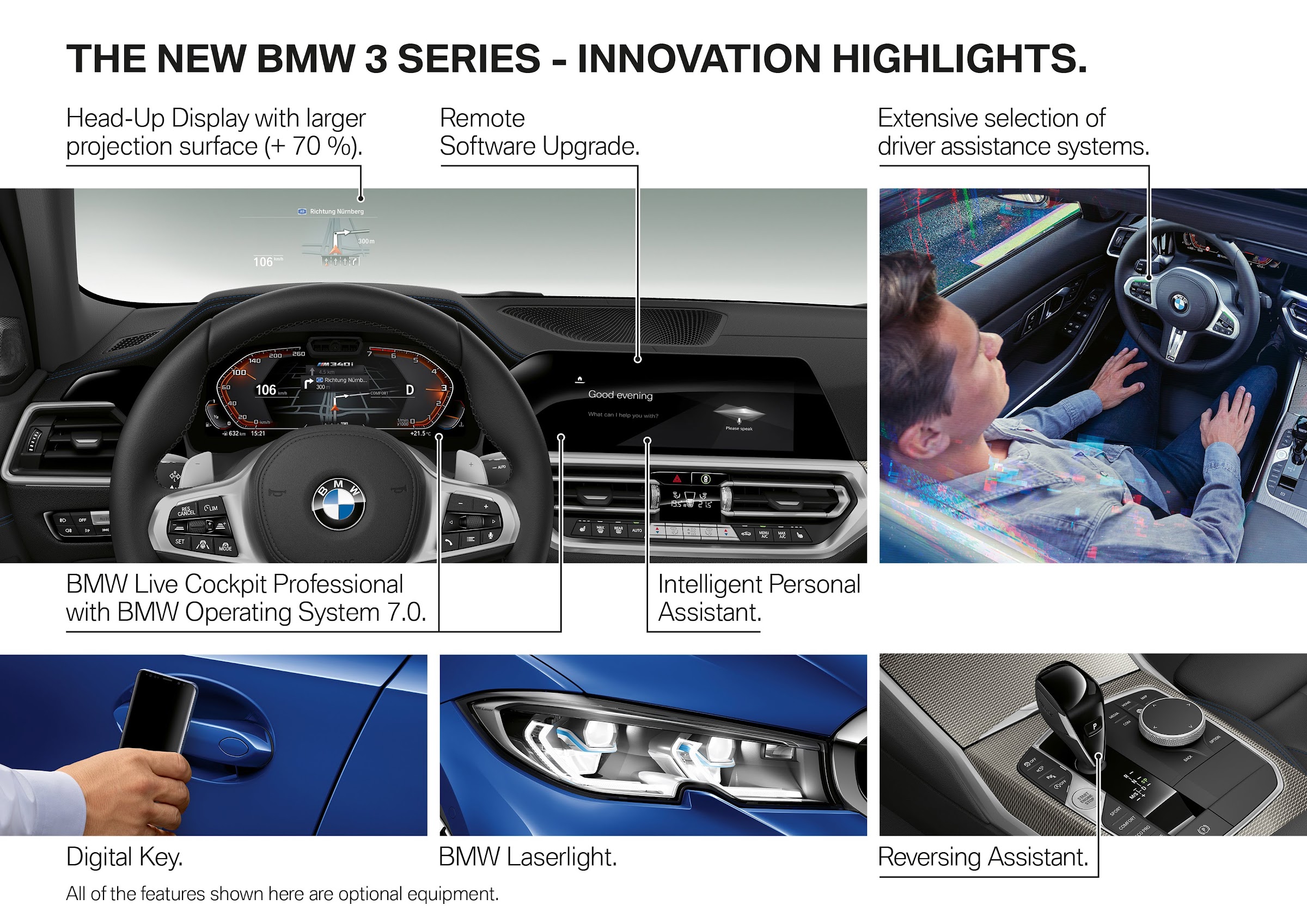 La nueva generación del Serie 3 da un salto tecnológico incorporando sistemas de asistencia a la conducción como: sistema Collision and Pedestrian Warning (alerta de colisión y de peatones) con función de frenado, de serie. El Driving Assistant Professional opcional comprende Active Cruise Control (Control de Crucero Adaptativo) con función Stop & Go, Steering and lane Control Assistant (que ayuda al guiar el coche en lugares angostos), Asistente de Mantenimiento de Carril con Protección de Colisión Lateral Activa y Ayuda de Esquiva, Alerta de Tráfico Cruzado, Aviso de Prioridad y Aviso de Sentido Contrario.