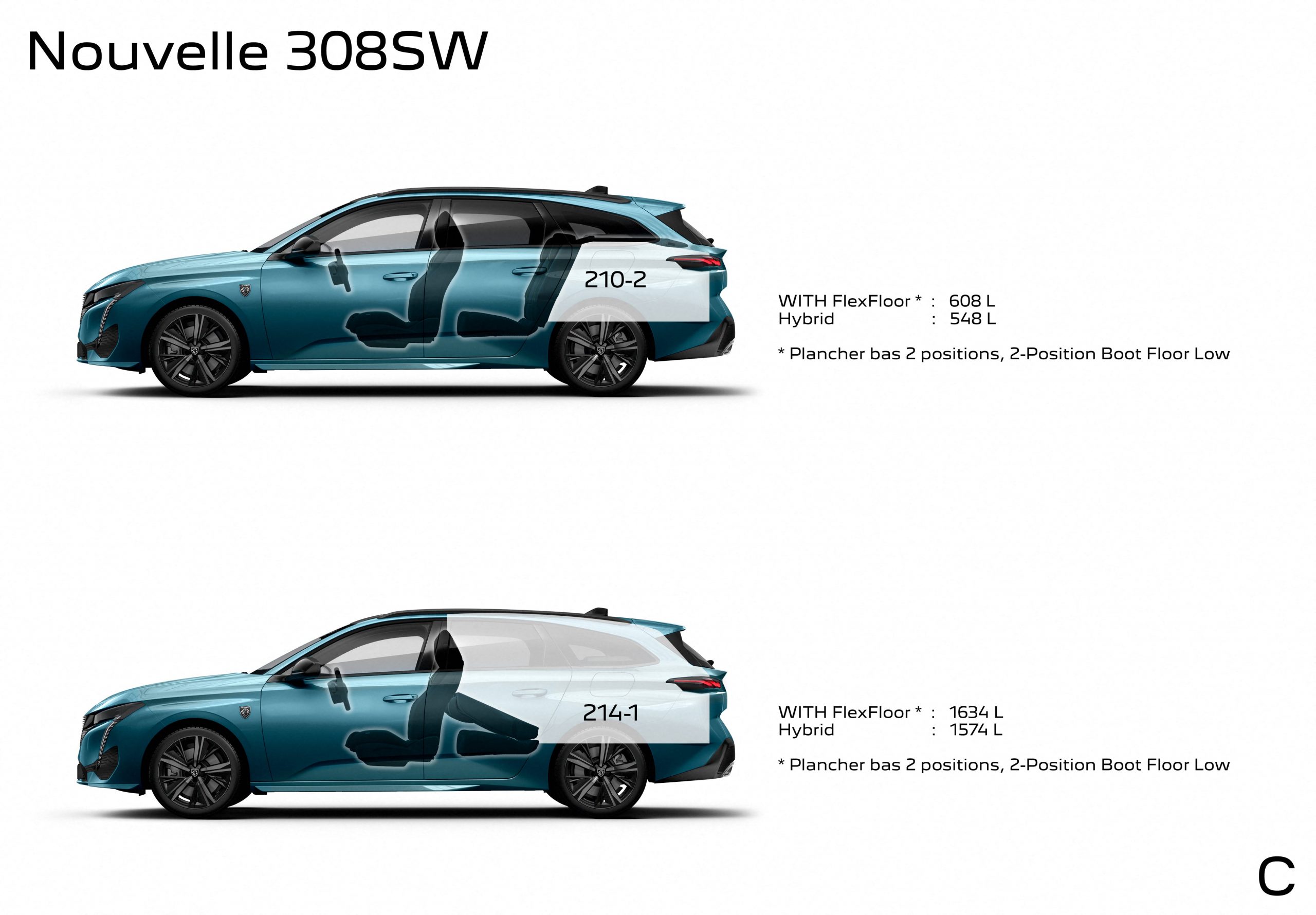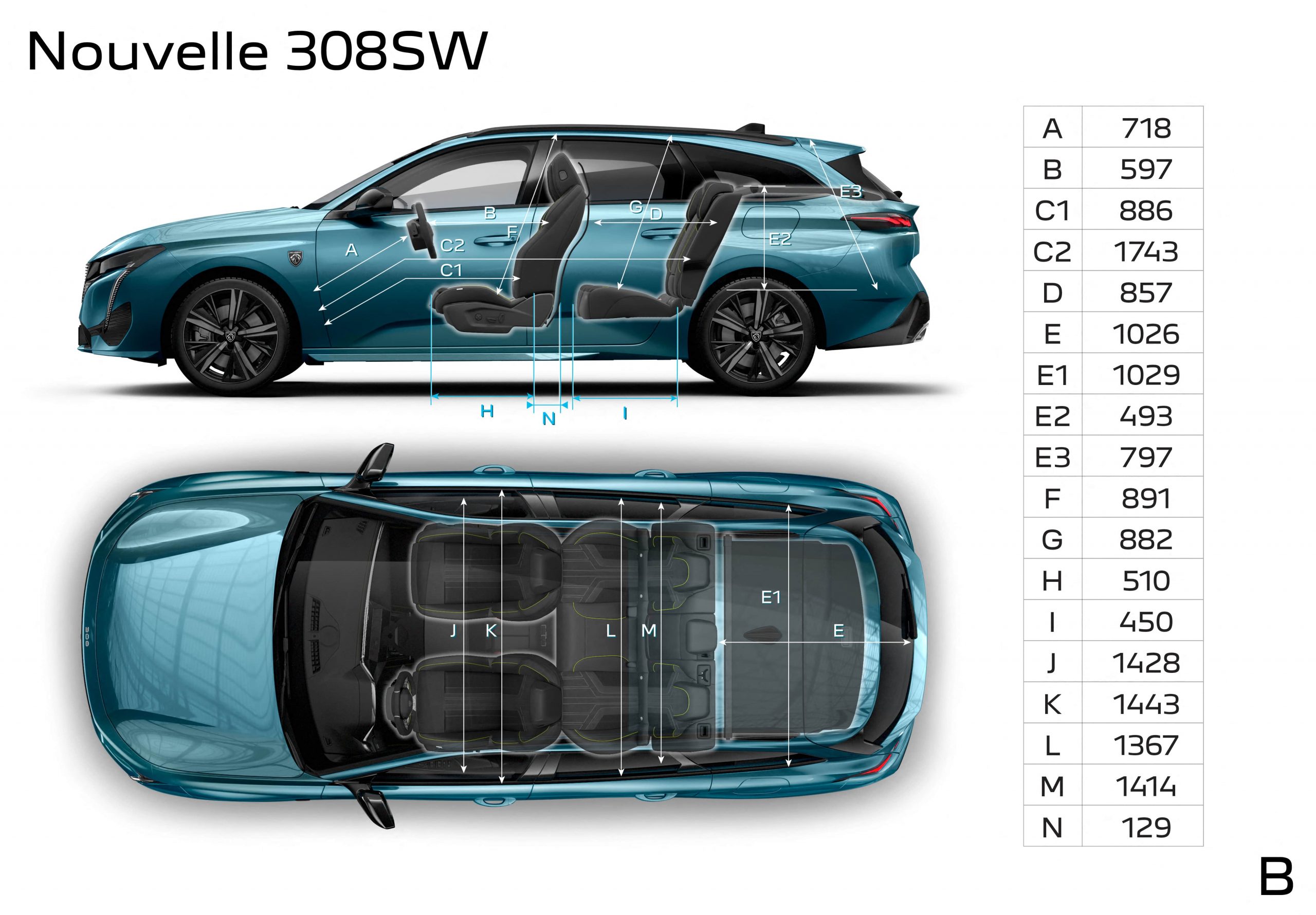 El Peugeot 308 SW tiene una longitud de 4,64 m y una distancia entre ejes de 2,73 m, 55 mm más que la versión convencional. Ofrece una carga para el maletero de 608 litros y hasta 1.634 litros con los respaldos de los asientos traseros abatidos. El portón del maletero está motorizado, pudiéndose accionar al pasar el pie por debajo del paragolpes, presionando el botón de la llave, pulsando el mando del portón trasero o pulsando el botón en el salpicadero.