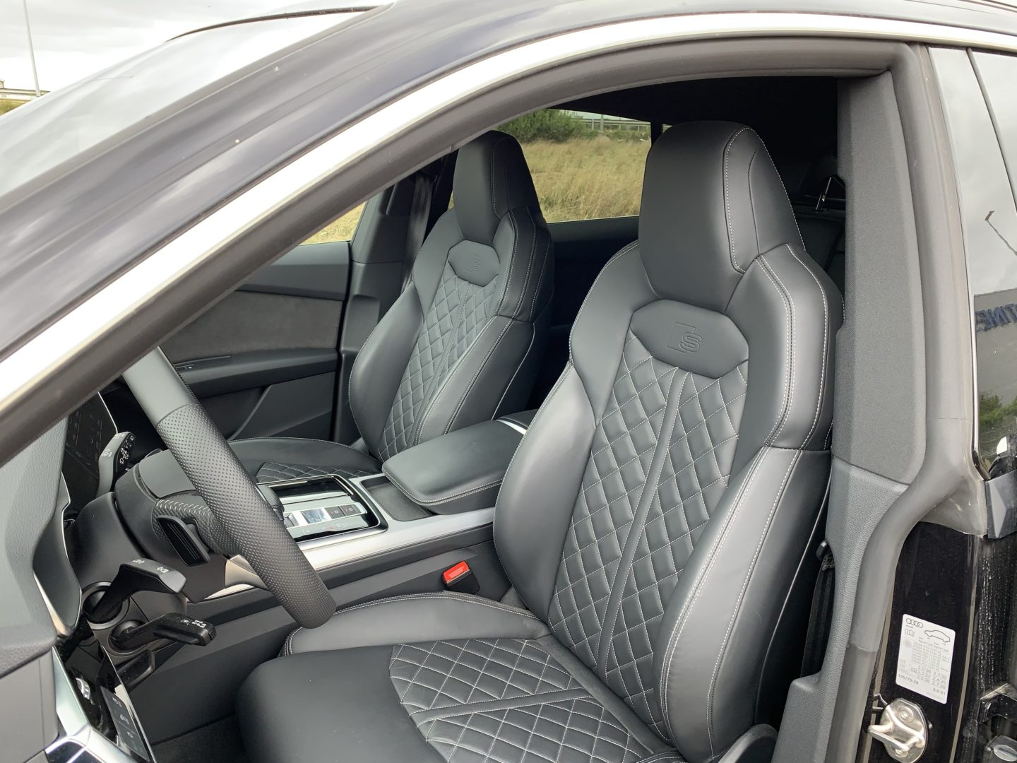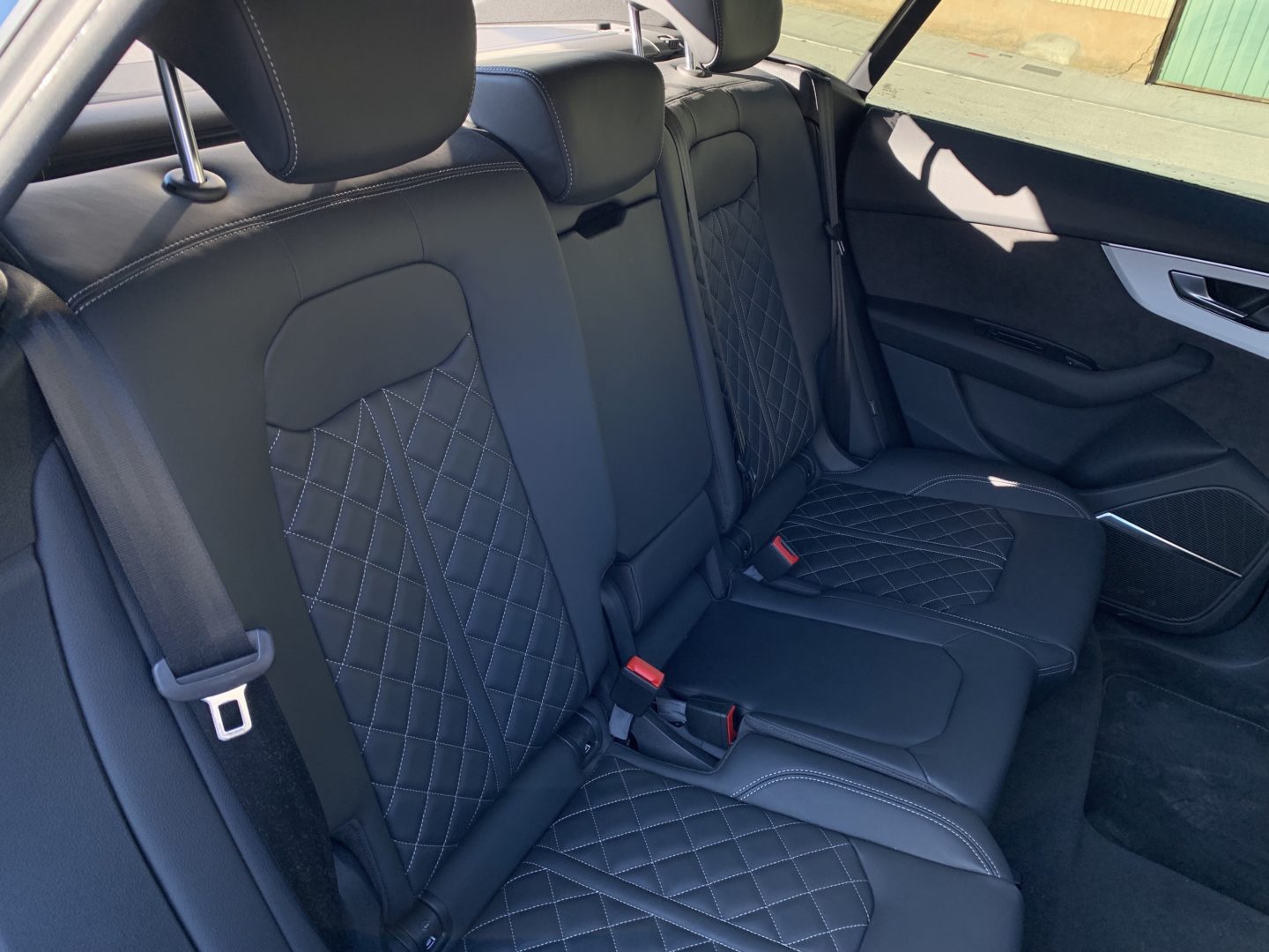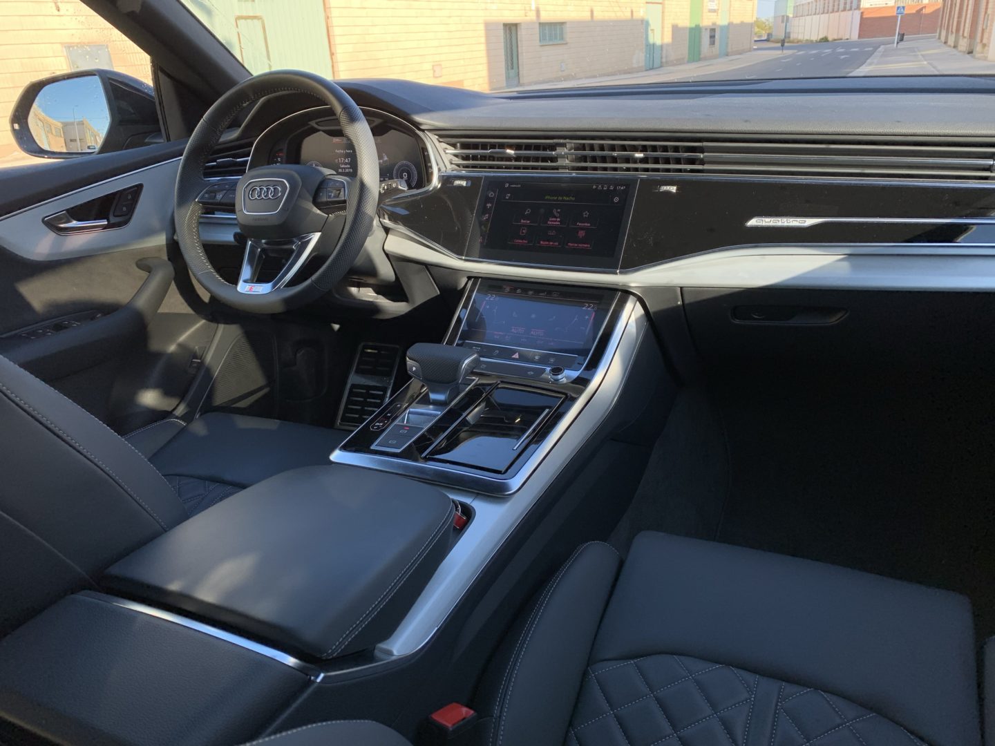 El equipamiento interior de serie incluye las pantallas como nuestra unidad, pero es necesario invertir bastante dinero en extras para que lo demás se parezca. Los asientos de serie están tapizados en tela y son bastante vulgares para estar incluidos en el Q8, parecen más bien de un Audi Q3. Si equipamos el paquete S Line, se incluyen unos asientos tapizados cuero y Alcántara mucho más agradables visualmente, pero este paquete tiene un coste bastante elevado (9.680€ en el momento de escribir este artículo). Los asientos S que equipa nuestra unidad tienen un sobrecoste de 3.135€ después de añadir el paquete S Line (haciendo un total de 12.815€) y están tapizados en cuero Valcona de muy alta calidad, son eléctricos y tienen muchos movimientos disponibles.