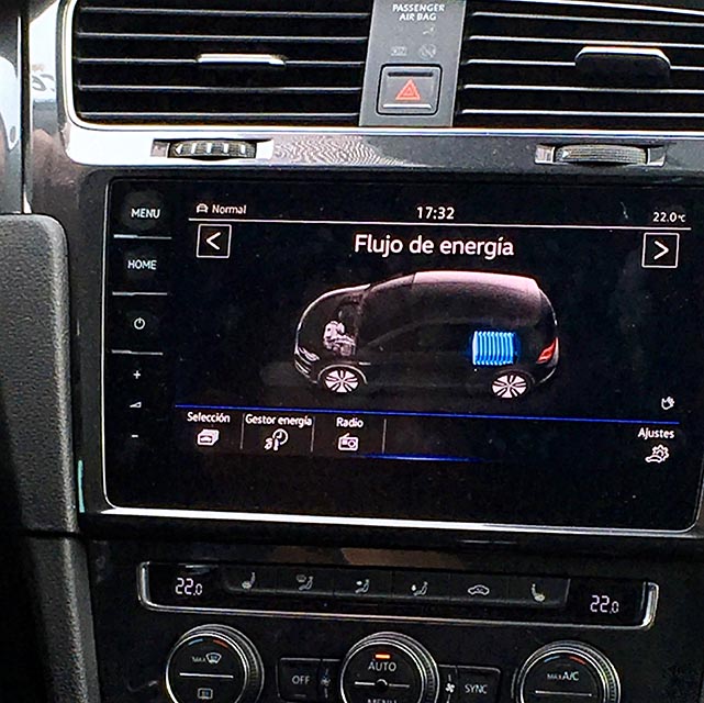 Los detalles en azul en el interior son otro elemento diferenciador con el resto de la gama Golf térmica y están presentes en el volante, la palanca de cambio o las costuras de los asientos, opcionalmente se puede equipar con luz ambiental en este color. El centro del salpicadero está presidido por una pantalla táctil con control gestual en color de 9,2 pulgadas, desde la cual podemos manejar el teléfono, navegador, equipo de música como la información/gestión del sistema eléctrico. Otra pequeña diferencia es el pomo, aunque parece igual que las versiones de motor térmico con cambio DSG, en vez de tener la opción de cambiar manualmente de marcha (modo manual), disponemos de opciones para elegir la retención del coche, que hablaremos de ella un poco más adelante.