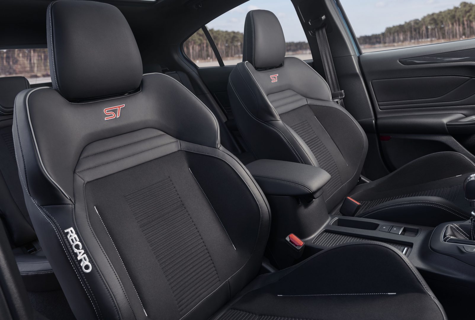 Pasando al interior, destacan los asientos firmados por Recaro con costuras en contraste y volante deportivo acabados en cuero; los pedales cuentan con material antideslizante. En el exterior destaca, el frontal más agresivo con tomas de aire de mayor tamaño, el alerón trasero de mayores dimensiones, la salida de escape doble o el difusor más deportivo. En colores exteriores el Focus ST se ofrece en Azul Ford Performance, Naranja Fury, Blanco Frozen, Gris Magnetic, Rojo Race, Rojo Ruby y Negro Shadow.
