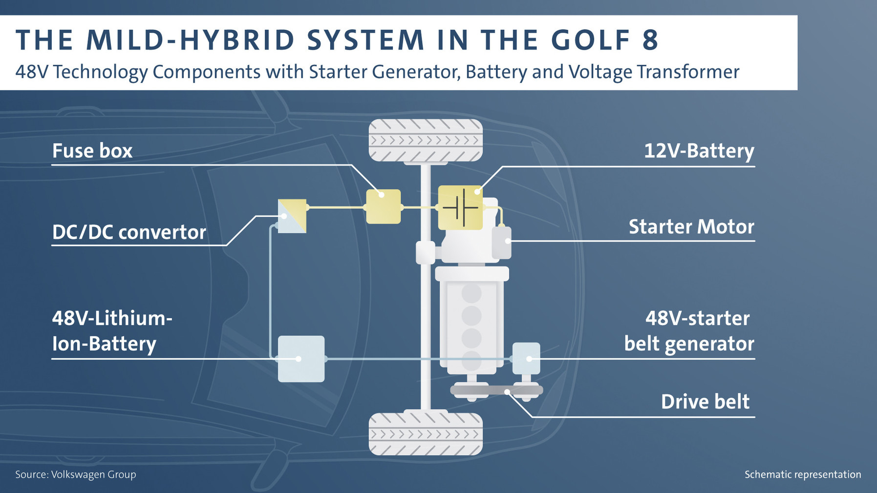La hibridación leve de 48 voltios (mHEV) será aplicada al motor 1.5 TSI, sumándose al de 12v convencional. El sistema de hibridación leve ayuda a reducir el consumo, incorpora una batería de iones de litio de 48 voltios ubicada debajo del asiento del pasajero delantero; y un generador de arranque integrado por correa (BSG), que se encuentra donde el alternador solía estar en el accionamiento auxiliar. Este generador actúa de dos formas, recupera la energía de frenado y ayuda al impulso de la unidad motriz. El generador ayuda al motor principalmente al iniciar la marcha, momento en el cual el consumo es mayor.